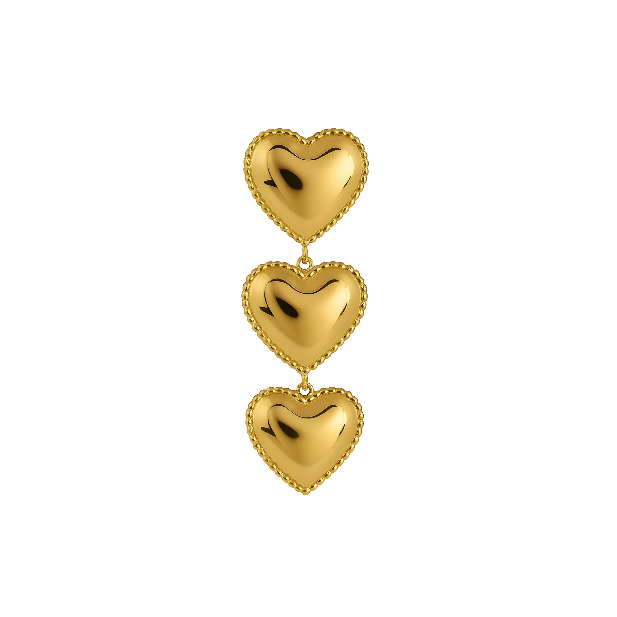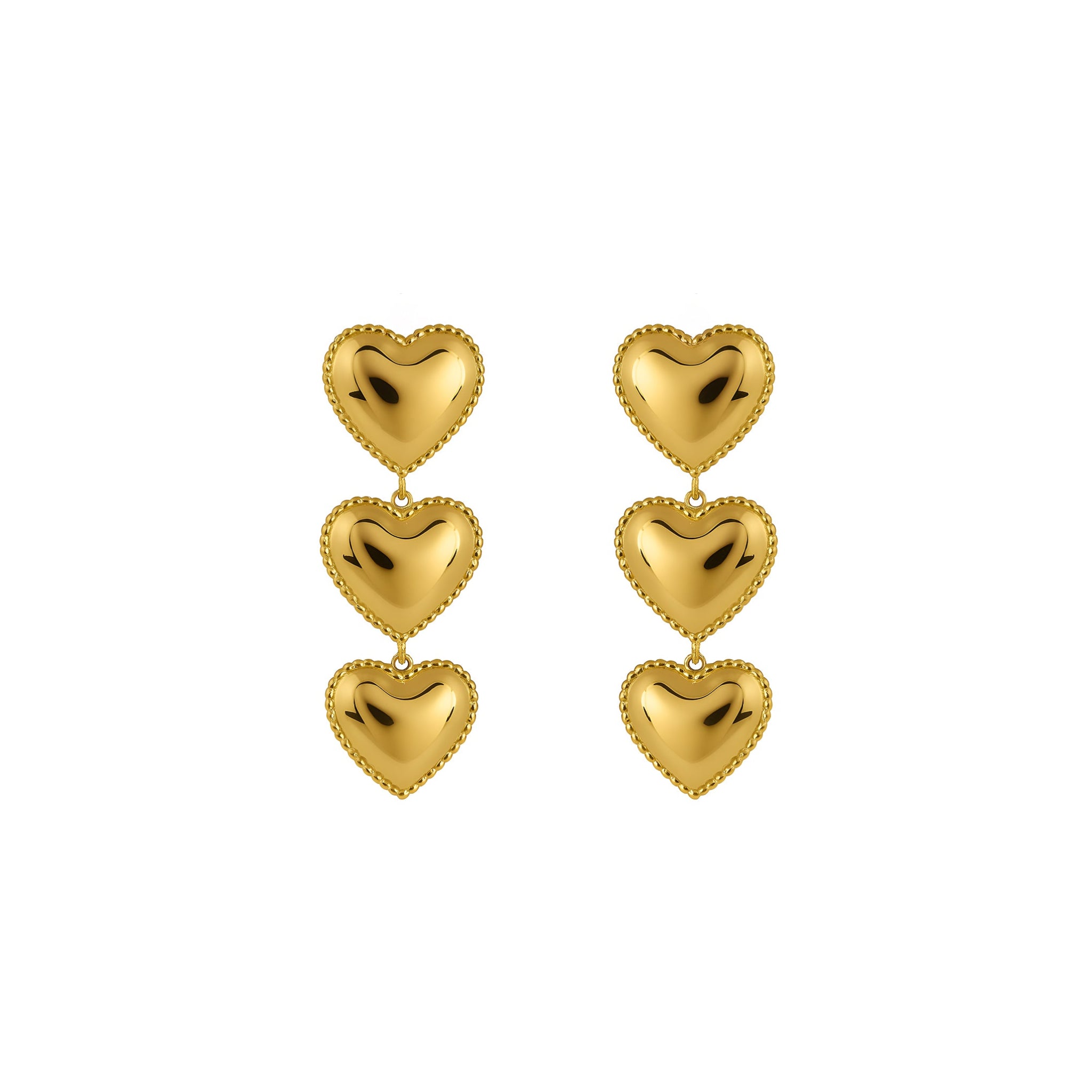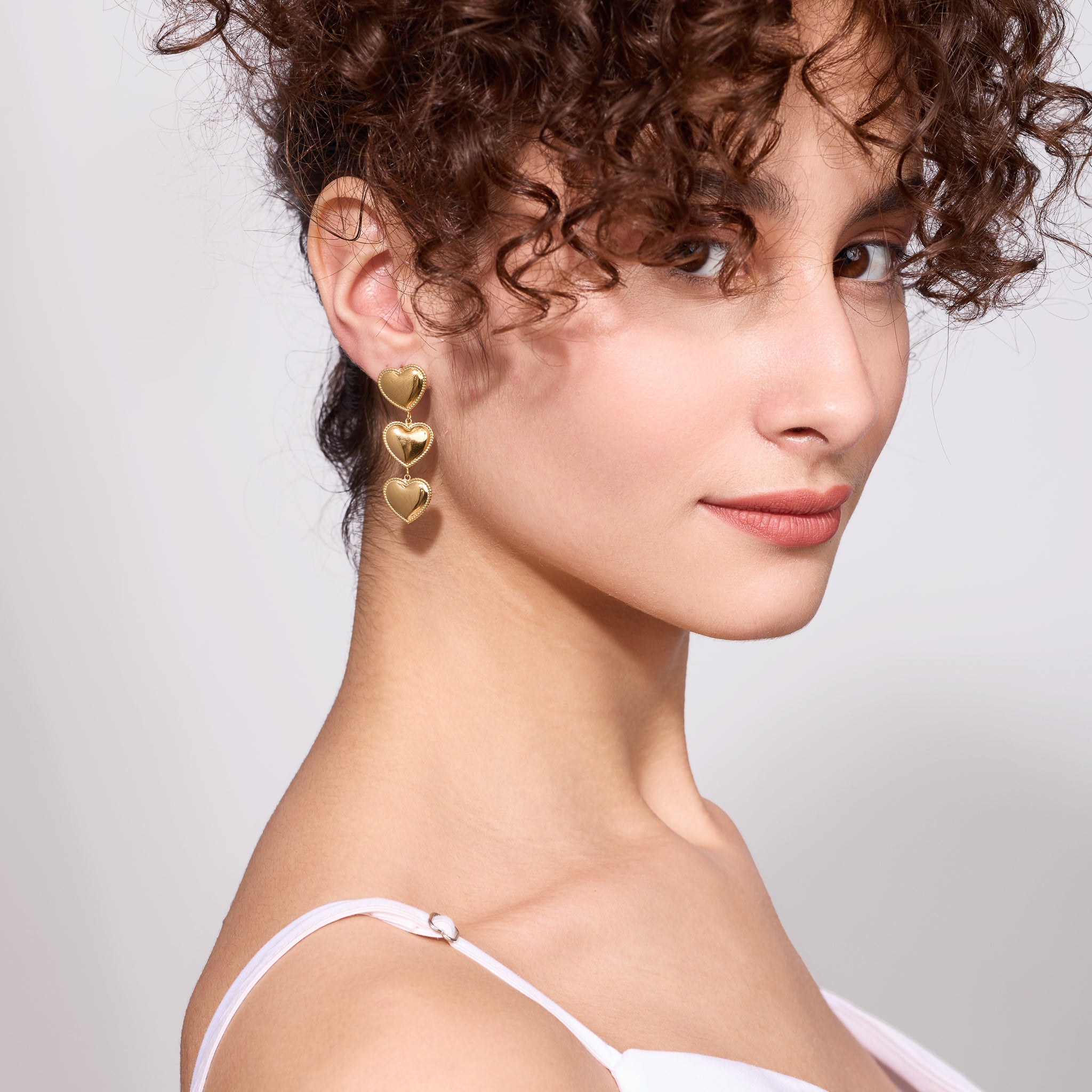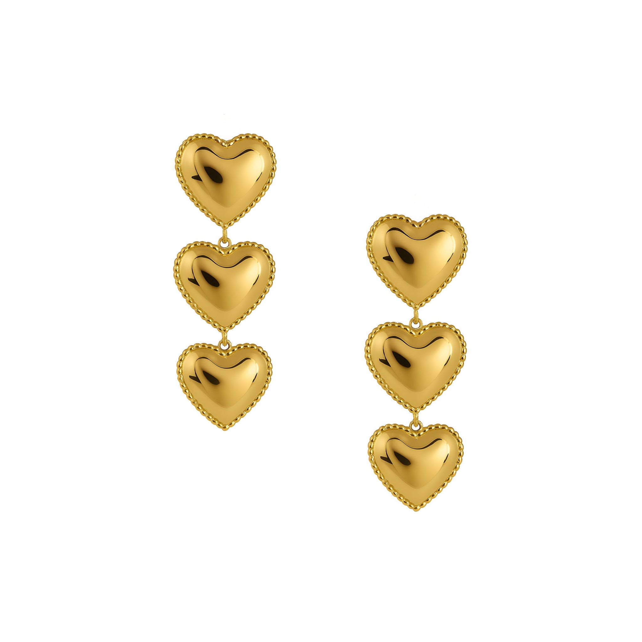 The Embrell Solferia Amoura Earrings (love) celebrate affection with a playful cascade of sculpted hearts. Their soft curves and high-shine finish reflect warmth and joy, making them perfect for sunny escapes, romantic evenings, or simply brightening everyday looks with a golden touch.