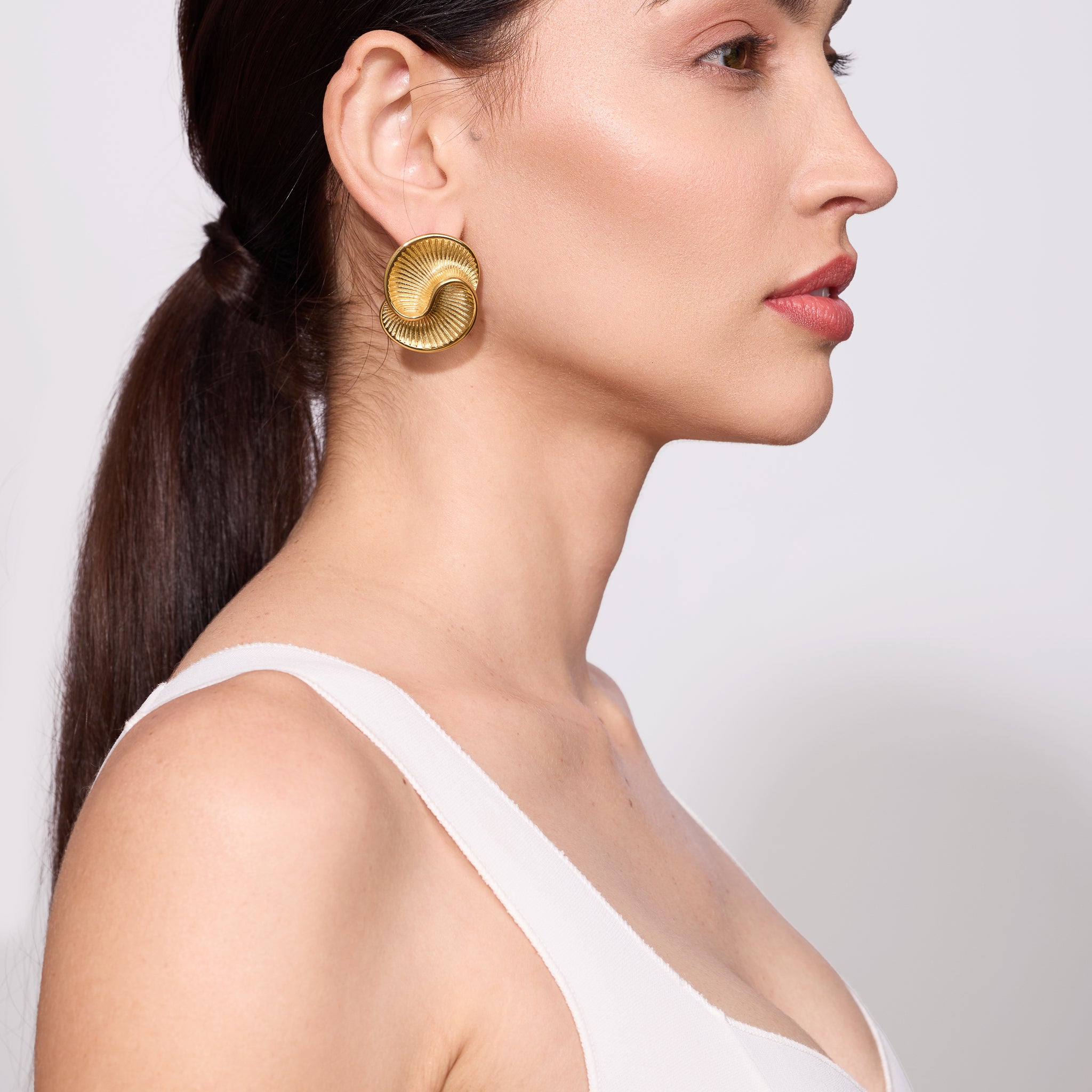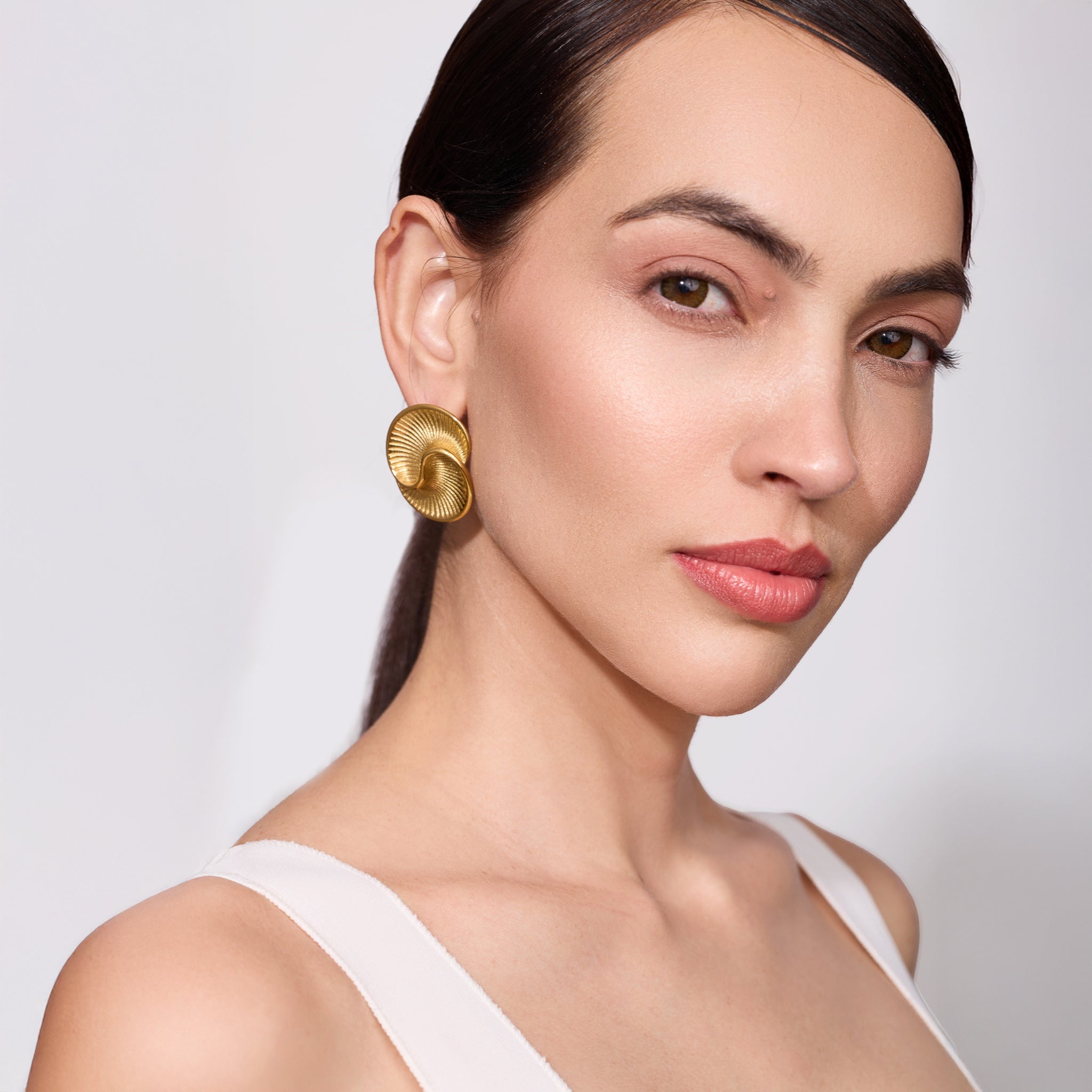 The Embrell Solferia Aurelia Earrings (golden) channel golden hour glamour with their bold, shell-inspired silhouette and rippling texture. With every curve catching the light, they evoke the warmth of coastal escapes and the drama of carefree summer evenings. Striking yet grounded, they’re designed to move effortlessly from destination dinners to open-air celebrations.