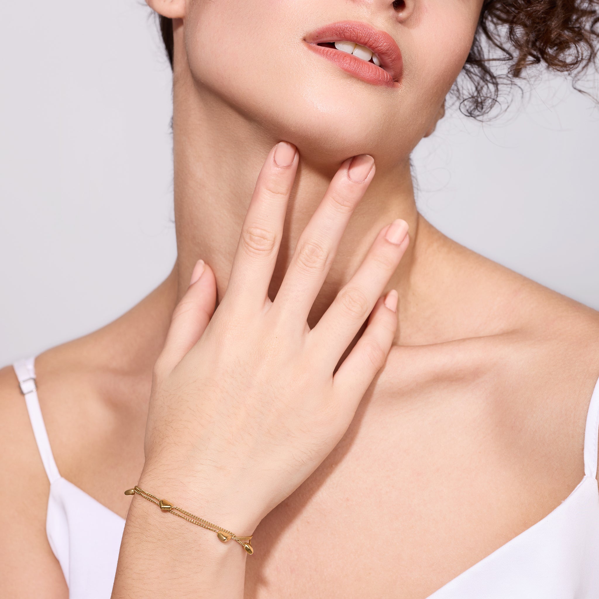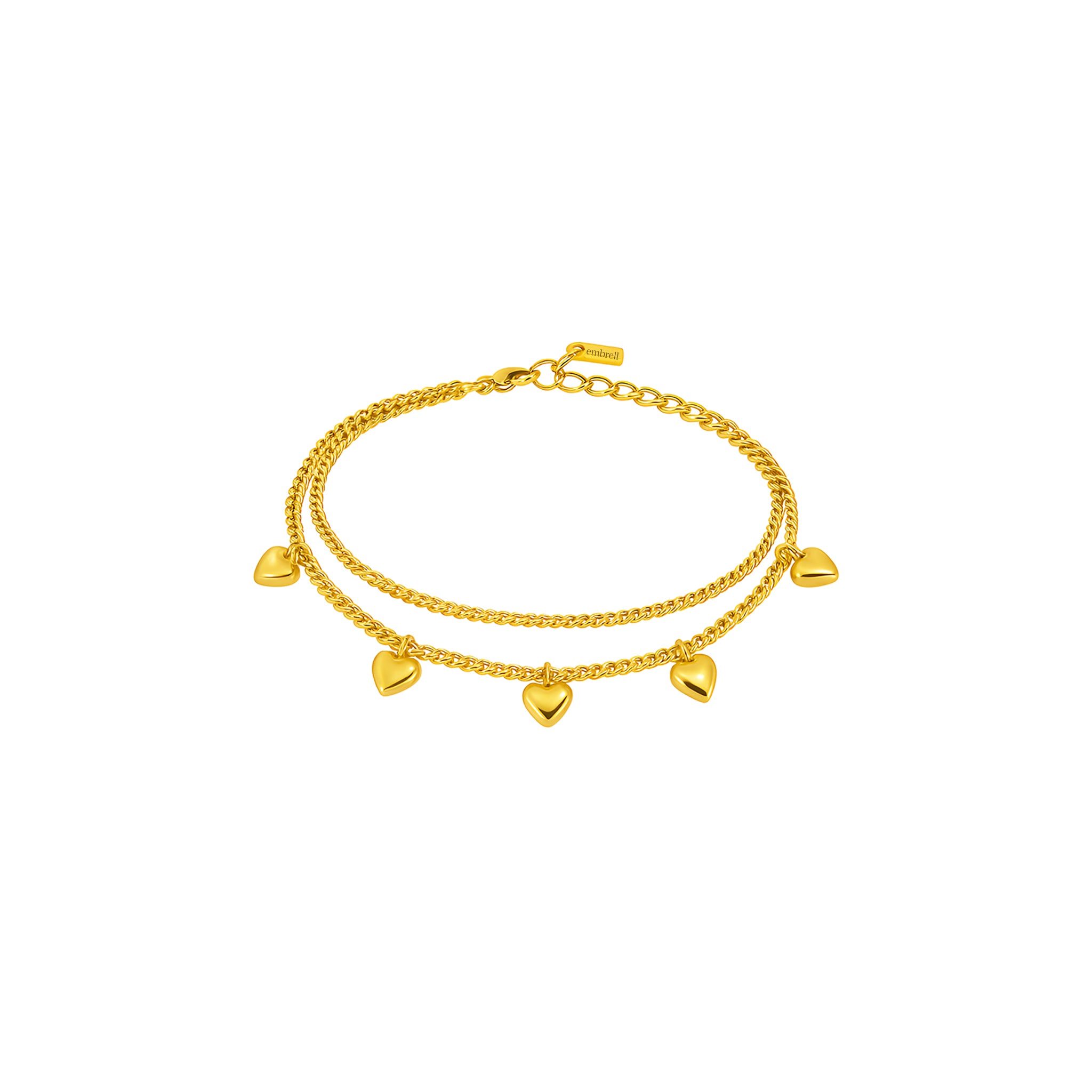 The Embrell Solferia Minara Bracelet (guiding light) features dual fine chains dotted with polished heart charms. Light and feminine, it’s designed to add a subtle romantic touch to everyday styling, perfect for stacking or wearing solo.